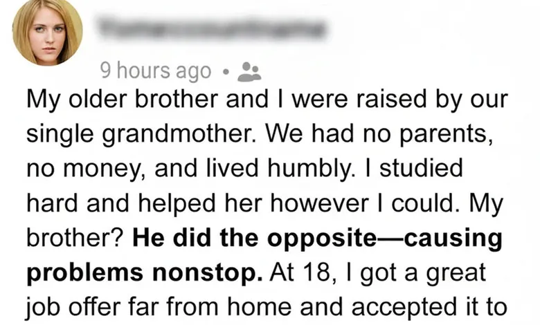 My older brother and I were raised by our single grandmother. We had no parents, no money, and lived humbly. I studied hard and helped her however I could. My brother? He did the opposite—causing problems nonstop. At 18, I got a great job offer far from home and accepted it to help fix up…