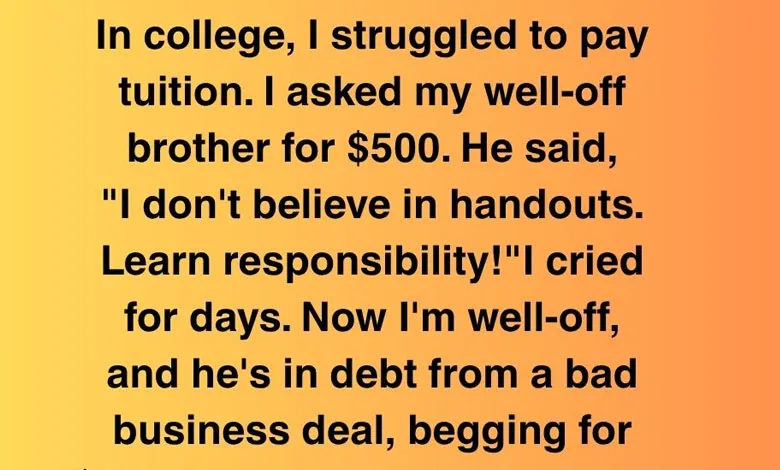 In college, I struggled to pay tuition. I asked my well-off brother for $500. He said, “I don’t believe in handouts. Learn responsibility!” I cried for days. Now I’m well-off, and he’s in debt from a bad business deal, begging for $5K. I saw my shot at payback, but to avoid looking petty, I agreed, took his account details, then instead…