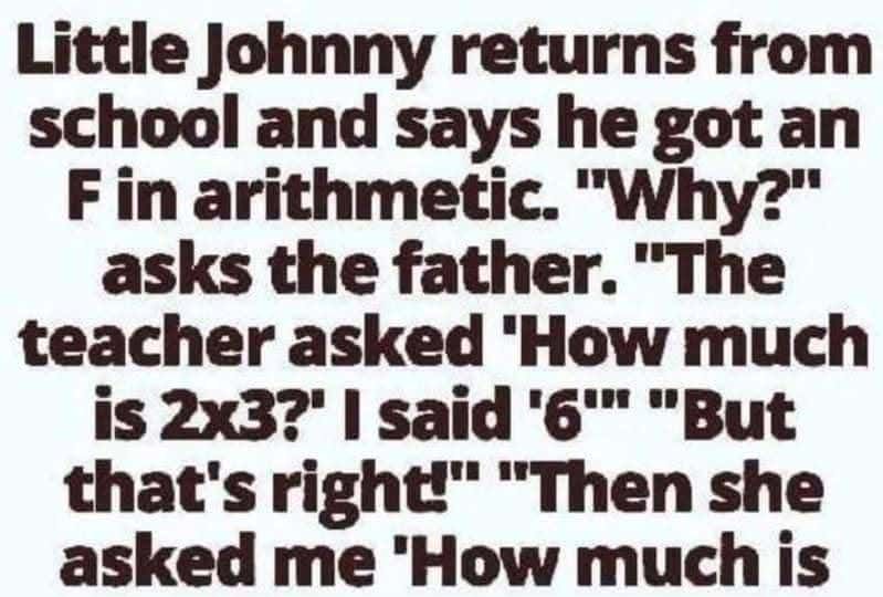 One afternoon, Johnny came home looking defeated. “Dad, I got an F in math today,” he sighed. His father, puzzled, asked what happened. Johnny explained, “The teacher asked me, ‘What’s three times two?’ and I said six.” His dad nodded. “So far, so good.”“Then,” Johnny continued, “she asked, ‘What’s two times three?’ and I said six again.” His father frowned. “That’s still right. Why’d you get an F?” Johnny grinned and said, “That’s what I told her — ‘What’s the difference?’” His dad burst out laughing, shaking his head. Johnny might have been right, but attitude mattered more than math that day!