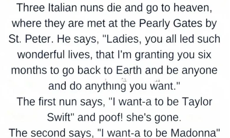 At the Pearly Gates, beneath clouds arranged with the neatness of an art museum, three Italian nuns arrived together after long, faithful lives. St. Peter welcomed them warmly, smiling as he checked their names off a very shiny list. “Sisters,” he said kindly, “you lived with compassion, humility, and good humor. As a reward, Heaven is granting you something special. You may return to Earth for six months and be anyone you wish, doing anything you choose—just for fun.” The nuns looked at one another in astonishment. A lifetime of rules, routines, and quiet discipline, and now… total freedom. Their eyes sparkled like children given permission to stay up past bedtime.