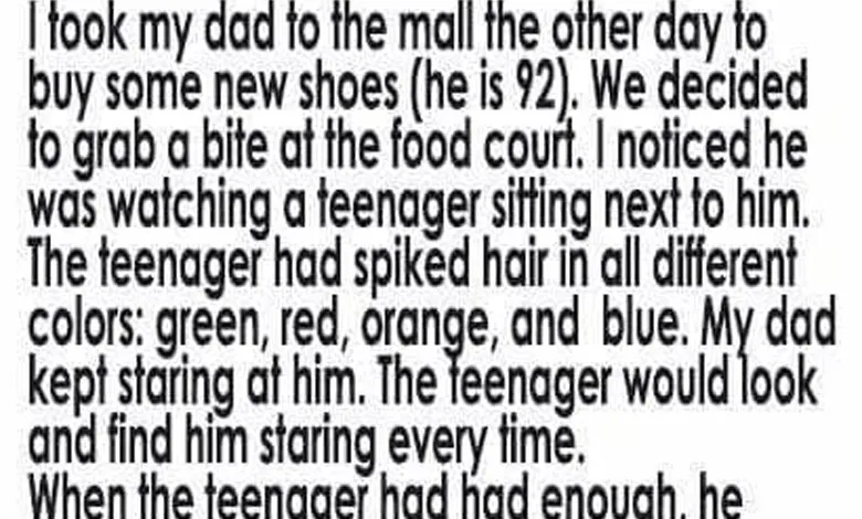 The noise of the food court seemed to fade. The boy’s smirk disappeared, replaced by quiet reflection. My dad continued, “It’s wonderful that you show your colors. Just remember—the brightest thing you can share with the world is your character.” The teen’s shoulders dropped, and after a pause, he murmured, “Thank you.” Dad nodded once and went back to his soup, as if he hadn’t just handed out a lifetime’s worth of wisdom.