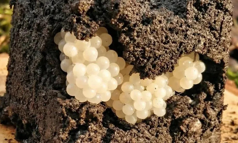 A calm afternoon in the garden took an unexpected turn when tiny white spheres appeared beneath the damp soil. At first glance, they looked almost decorative—smooth, clustered, and pearl-like among the roots and mulch. Their delicate shape seemed strangely out of place in the natural mess of leaves and dirt.
