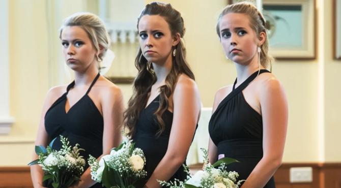 Her eyes darted from one bridesmaid to the next, taking in the dark silhouettes, the somber energy, and the whispers rippling through the guests.