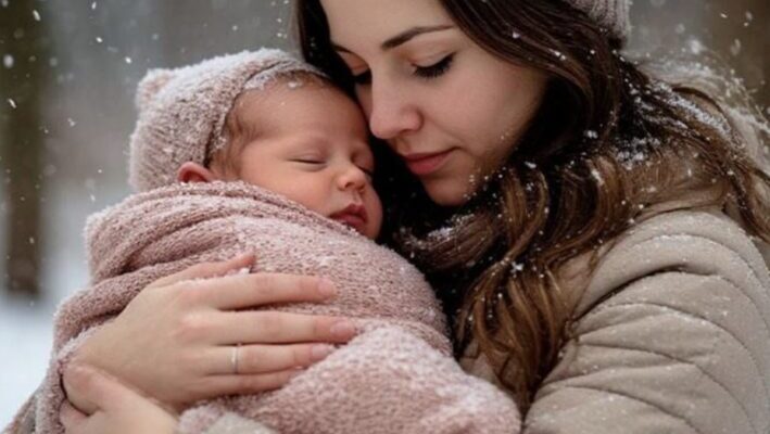 In her arms, she held a child — a tiny bundle in a gray blanket, with a little cap on his head.