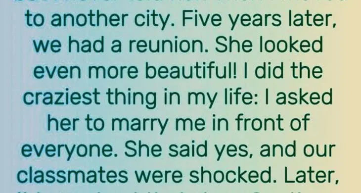 After 5 years, my classmates planned a reunion. I saw her there, and she looked even more beautiful! I did the craziest thing in my life: I asked her to marry me in front of everyone. She said yes, and our classmates were shocked.