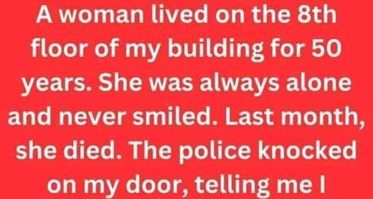 This woman had lived on the 8th floor of my building for 50 years. She was always alone, and never smiled. All the neighbors avoided her because she could start a fight at any moment. Last month, she died. The police knocked on my door, telling me I should go up to her flat with them.