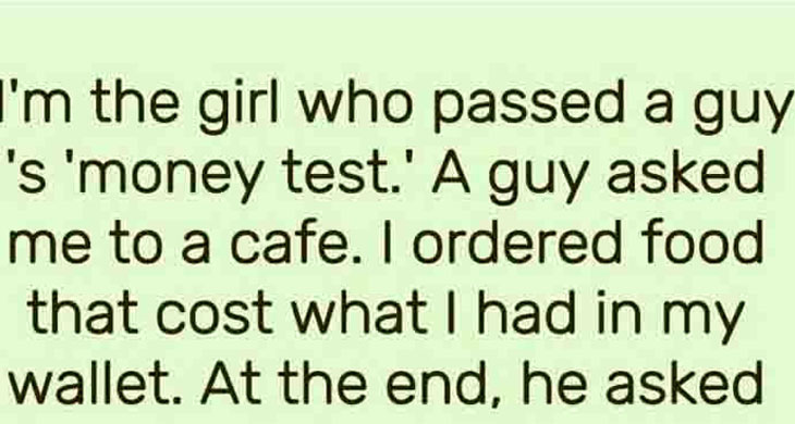 it well. She got into that university and rented a place near his neighborhood. My mom rolls her eyes, but I’m very happy for her. Yes, she is obsessed with this actor, but this motivation helped her change her life. She’s been living in Spain for a few years now, still a fan, and her new boyfriend is okay with it. I’m proud of her. STORY2 : I’m the girl who passed a man’s “money test.” A guy asked me to a,