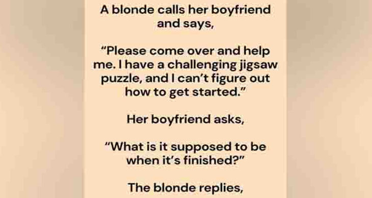 A blonde calls her boyfriend and says, “Please come over and help me. I have a challenging jigsaw puzzle, and I can’t figure out how to get started.”