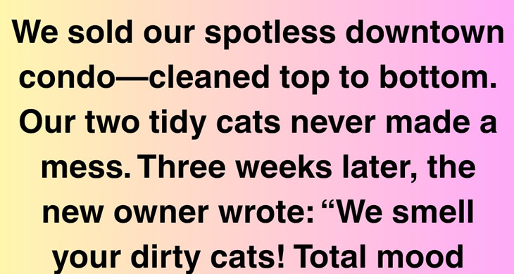 We sold our spotless downtown condo—cleaned top to bottom. Our two tidy cats never made a mess. Three weeks later, the new owner wrote: “We smell your dirty cats! Total mood killer. WE EXPECT $10,000.” I called our realtor, who said we owed nothing. But my wife had other plans. The condo was smart, and we still had app access, so she logged in, turned off the lights, then flashed them like a disco strobe. She adjusted the thermostat to freezing, then boiling. We heard back almost instantly: “What’s going on with the climate control? The lights won’t stay on!” My wife giggled like a kid who’d just pulled a perfect prank. I told her it was risky, but she shrugged. “He threatened us first.”
