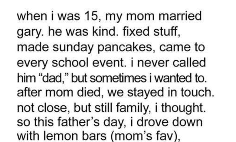 On Father’s Day, I returned to my childhood home with lemon bars, a WWII biography, and a heartfelt card I’d spent a decade writing—ready to finally thank Gary, the man who stepped in after my real father vanished. Gary had been steady and quiet, never asking for recognition, yet always present through school plays, Sunday pancakes, and quiet holidays, especially after my mother passed away. I thought this visit would bring closure.