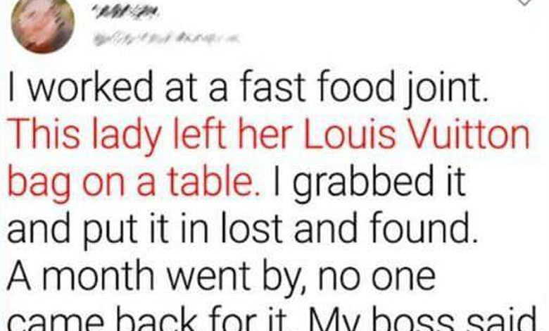 One day while working at a fast food restaurant, I noticed a woman had left her Louis Vuitton bag behind. After waiting 20 minutes and realizing she wasn’t coming back, I turned it in to the lost and found without even peeking inside. A month passed, and no one claimed it.
