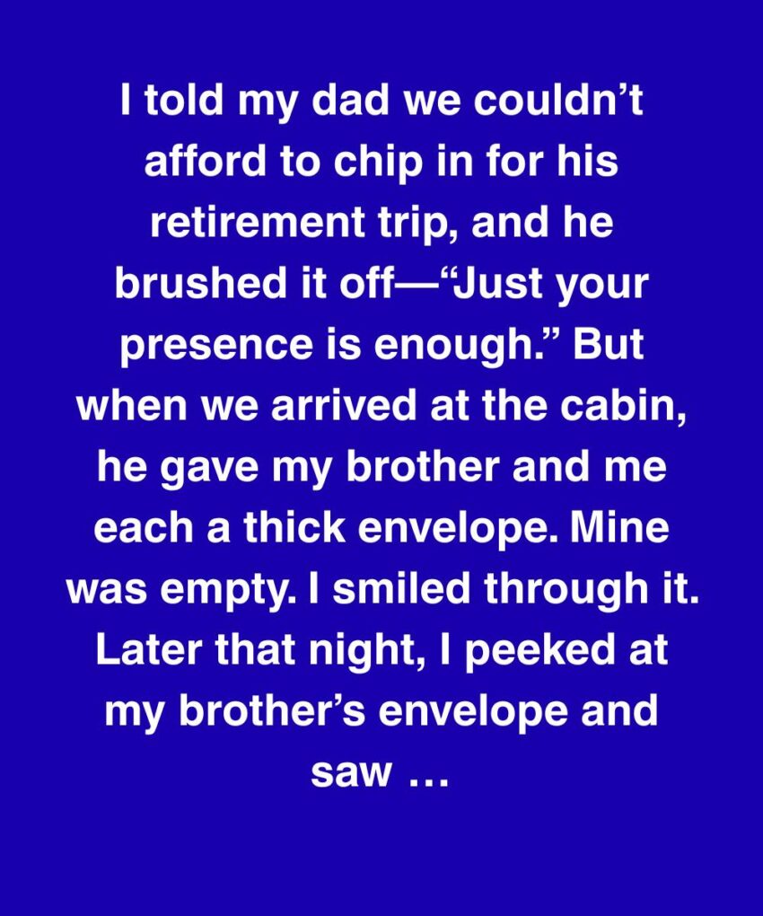 I told my dad we couldn’t afford to chip in for his retirement trip, and he brushed it off—“Just your presence is enough.” But when we arrived at the cabin, he gave my brother and me each a thick envelope. Mine was empty. I smiled through it. Later that night, I peeked at my brother’s envelope and saw a check for $15,000.