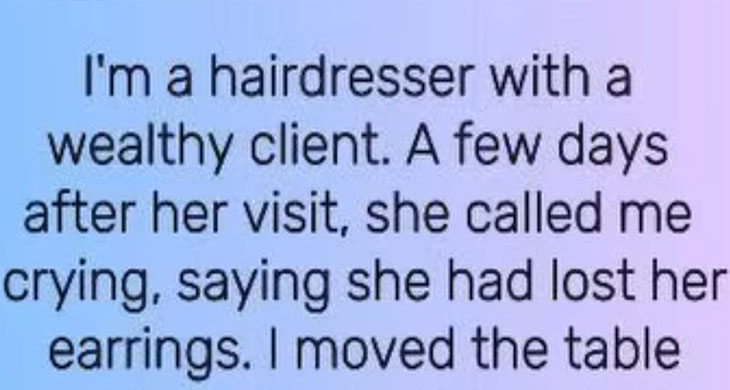even years later. One could say that people who work with people don’t have boring jobs. “I cut hair for a living.” My client is very wealthy. A few days after her visit, she broke down in tears and told me she had lost her earrings. Didn’t I find them?