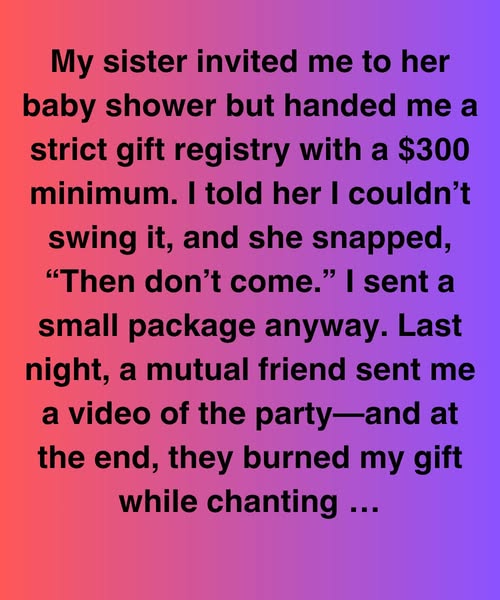 My sister invited me to her baby shower but handed me a strict gift registry with a $300 minimum. I told her I couldn’t swing it, and she snapped, “Then don’t come.” I sent a small package anyway. Last night, a mutual friend sent me a video of the party—and at the end, they burned my gift while chanting something cruel that I still can’t shake: “If she can’t pay, throw it away!”