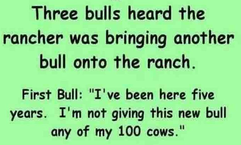 Third Bull: “I’ve only been here a year, and so far, you guys have only let me have 10 cows. I may not be as big as you fellows, but I’m keeping all 10 of my cows.”