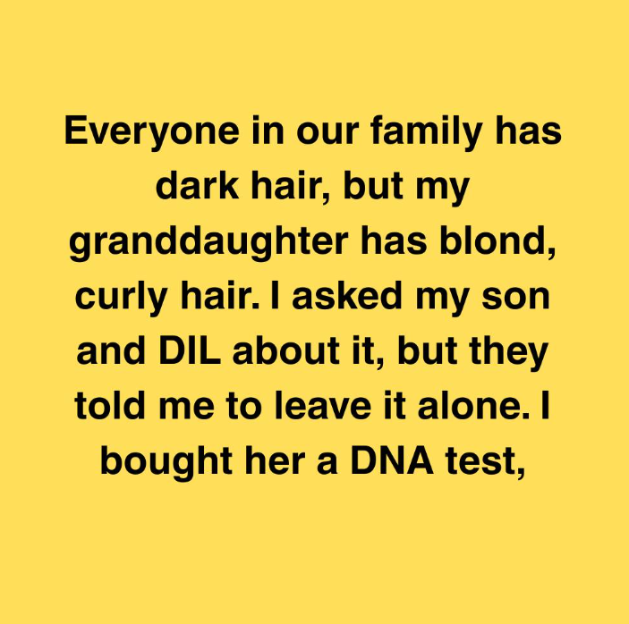 Everyone in our family has dark hair, but my granddaughter has blond, curly hair. I asked my son and DIL about it, but they told me to leave it alone. I bought her a DNA test.
