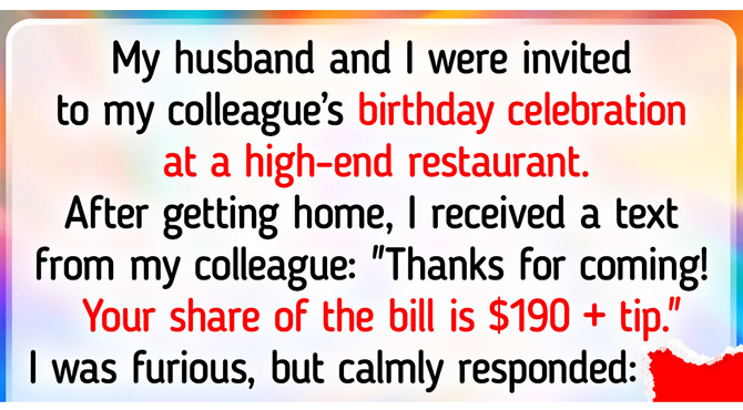 My husband and I were invited to my colleague’s birthday celebration at a high-end restaurant. After getting home, I received a text from my colleague: “Thanks for coming! Your share of the bill is $190 + tip.”