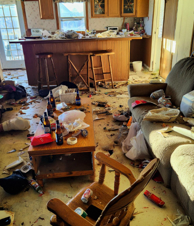 Empty alcohol bottles were lined on the kitchen counter like trophies, and crushed pizza boxes were scattered between crumpled plastic cups and cigarette butts ground into the floor.