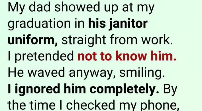 I told myself it was just for a second. That I’d wave later. That I’d find him after the ceremony when no one was watching. But the truth was uglier than that. I was embarrassed. Ashamed that my dad cleaned floors and emptied trash cans while other parents talked about law firms and corner offices.