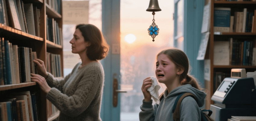 The bell above the bookstore door chimed softly as I was restocking the classics shelf, the late-afternoon light slanting through the dusty windows. It was usually my favorite time of day—quiet, calm, the kind of peace you only find among rows of books. That’s when I noticed her.