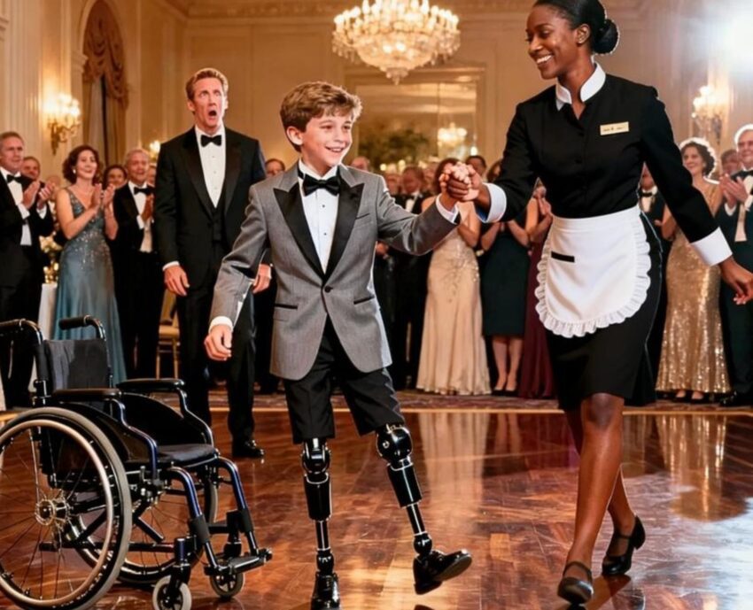 Evan sat near the dance floor, shoulders squared, hands folded carefully in his lap. His wheelchair—sleek, expensive, custom—waited behind him like a loyal shadow. Below the tailored tuxedo trousers were the prosthetics: polished black, precise, unapologetic. Evan’s smile was real but restrained, the kind learned early by children who understand how easily joy becomes spectacle.
