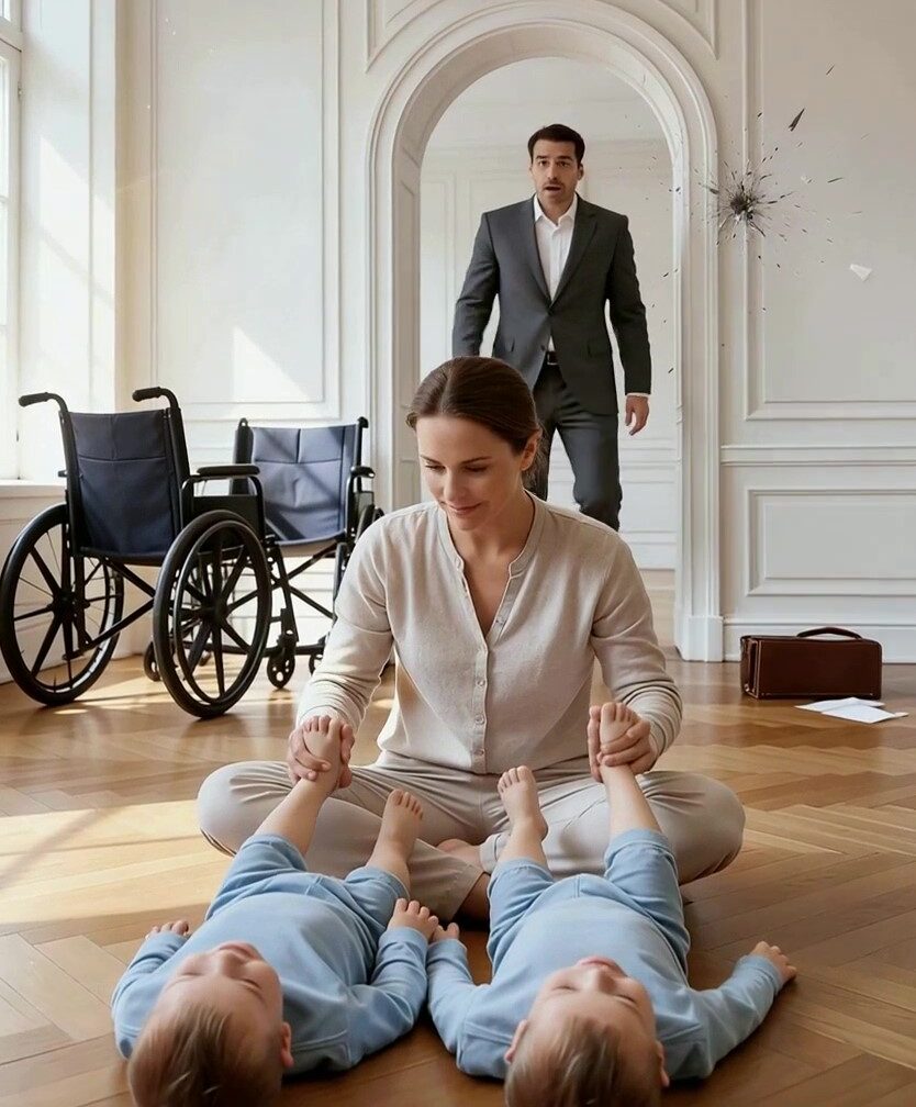 The leather briefcase slipped from his fingers and struck the wall with a dull thud, scattering papers across the polished floor. He barely noticed. His eyes were locked on the scene before him—one he had never imagined he would witness.The wheelchairs that were supposed to remain occupied at all times stood abandoned near the window, angled awkwardly like they had been shoved aside in a hurry. Sunlight streamed through tall glass panes, illuminating the padded wooden floor where his five-year-old twin sons sat cross-legged, their small, fragile legs stretched out in front of them.