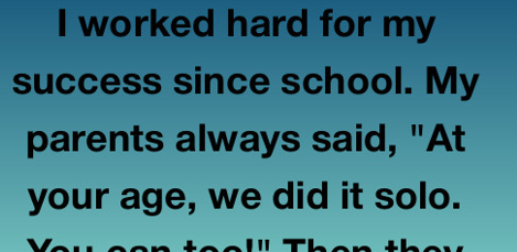 I worked hard for my success since school. I was the kid who took the double shifts at the local diner just to pay for my own textbooks, and the student who worked through every summer break while my friends were at the beach. My parents always said, “At your age, we did it solo. You can too!” It was their mantra, a badge of honor they wore like armor, insisting that struggling was the only way to build real character.