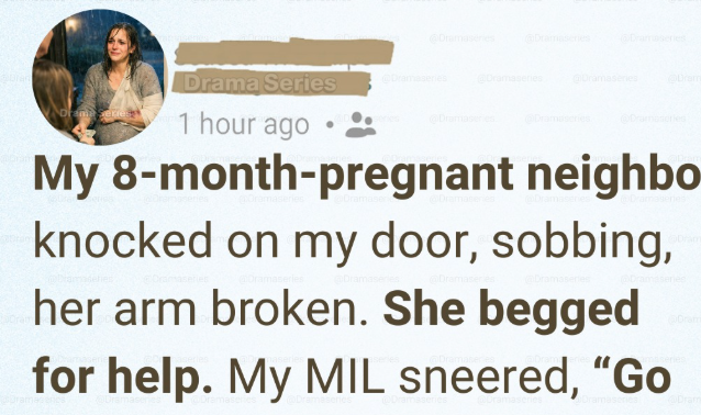 I froze, my hands still wet, my heart instantly uneasy. Before I could move, my mother-in-law muttered something sharp under her breath and stood up. “Probably someone begging again,” she said, already annoyed. She swung the door open without hesitation.On the doorstep stood my neighbor from two houses down. She was eight months pregnant—her belly unmistakable beneath a thin, soaked sweater. Her hair clung to her face, her eyes swollen and red from crying. One arm hung uselessly at her side, wrapped in a makeshift sling, already bruising purple.