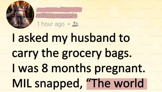 The evening had been ordinary, or at least it should have been. I was eight months pregnant, my body heavy and aching, every step reminding me of the life growing inside me. When we returned from the market, I asked my husband to carry the grocery bags. It wasn’t a demand, just a simple request—one that felt reasonable given my condition. But before he could even respond, my mother-in-law’s sharp voice cut through the air like a blade.“The world doesn’t spin around your belly,” she snapped, her eyes narrowing with disdain. “Pregnancy isn’t sickness.”