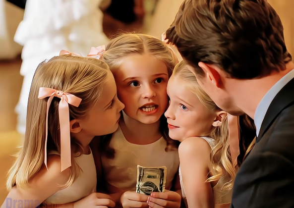 Instead, three little girls stood beside his table in a line so neat it made him blink twice. They looked about six—maybe seven—each with light curls pulled back by matching pale-pink ribbons. Their dresses were pressed, their shoes shiny, and their expressions… serious. Like they’d rehearsed.