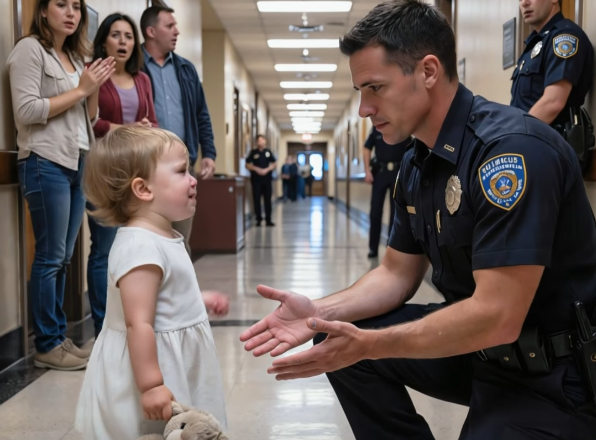 The little girl studied him carefully, the way toddlers examine anything unfamiliar and important. Her gaze moved slowly over his uniform, his badge, and the radio clipped to his belt, as if verifying every detail before trusting him with her secret.