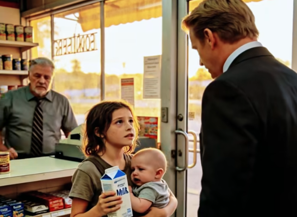 She held her infant brother tightly in one arm, his tiny body pressed against her chest for warmth and comfort. In her other hand, she clutched a carton of milk. Her fingers were small, but they gripped it with quiet determination.