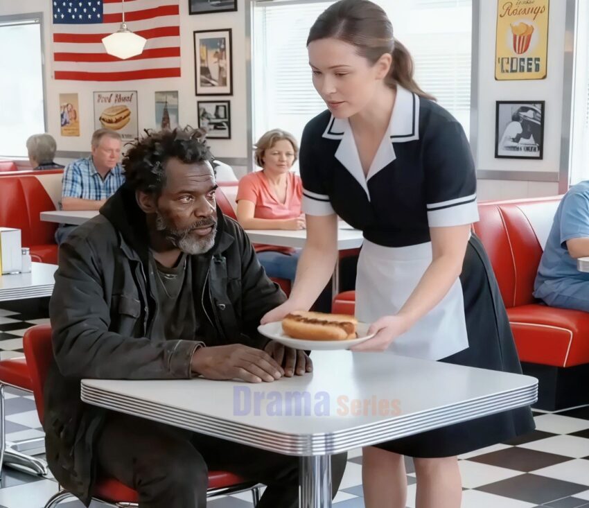 He sat in the corner booth near the window, shoulders hunched as if he was trying to take up as little space as possible. His coat was old and weather-beaten, the color faded into something that might once have been brown. His hair was uncombed, his beard threaded with gray. His hands, resting on the table, looked rough—like they’d held onto life through things most people never had to imagine.