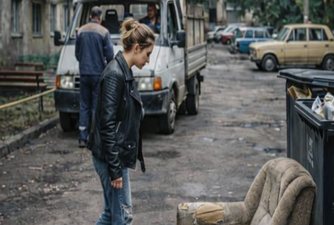 At that exact moment, a small truck pulled up. Two men quickly unloaded the worn furniture, dropped it carelessly near the bins, and sped away without even looking back.