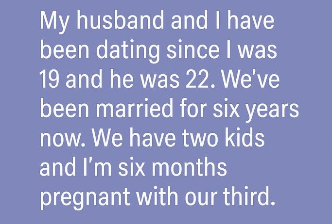 My husband and I have been dating since I was 19 and he was 22. We’ve been married for six years now. We have two kids and I’m six months pregnant with our third. Reddit