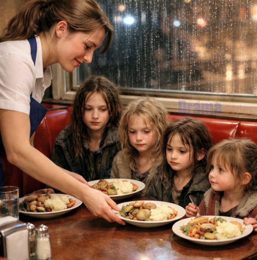 Slowly, they followed her inside. She guided them to a booth near the window and hurried to the kitchen. Moments later, she placed four steaming plates of food in front of them. “Eat as much as you like,” she said, her voice tender. “No one should go hungry.”