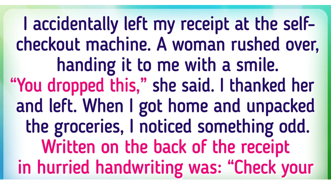 I accidentally left my receipt at the self-checkout machine. A woman rushed over, handing it to me with a smile. “You dropped this,” she said. I thanked her and left.