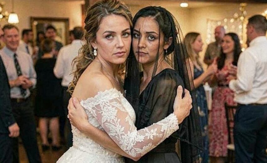 She stood by the cake in a black mourning dress, a dark veil over her face. The fabric clung to her in a dramatic way, heavy and deliberate. She looked as if she were at a funeral, not her older sister’s wedding.