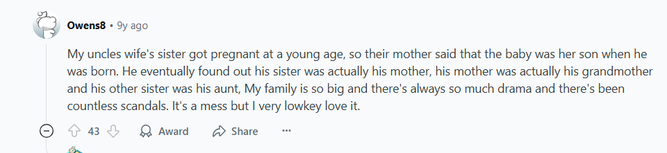 My uncle’s wife’s sister got pregnant at a young age, so their mother claimed the baby as her own when he was born. He eventually found out that his sister was his mother, his mother was his grandmother, and his other sister was his aunt.