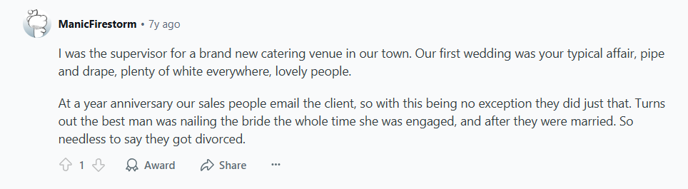 Then, one weekend, she said she was going to a work event about 250 miles away and would be staying in a motel there. Steve grew suspicious and decided to call the room late at night, around 1 am. A guy answered… it was our other brother… © Unknown author / Reddit